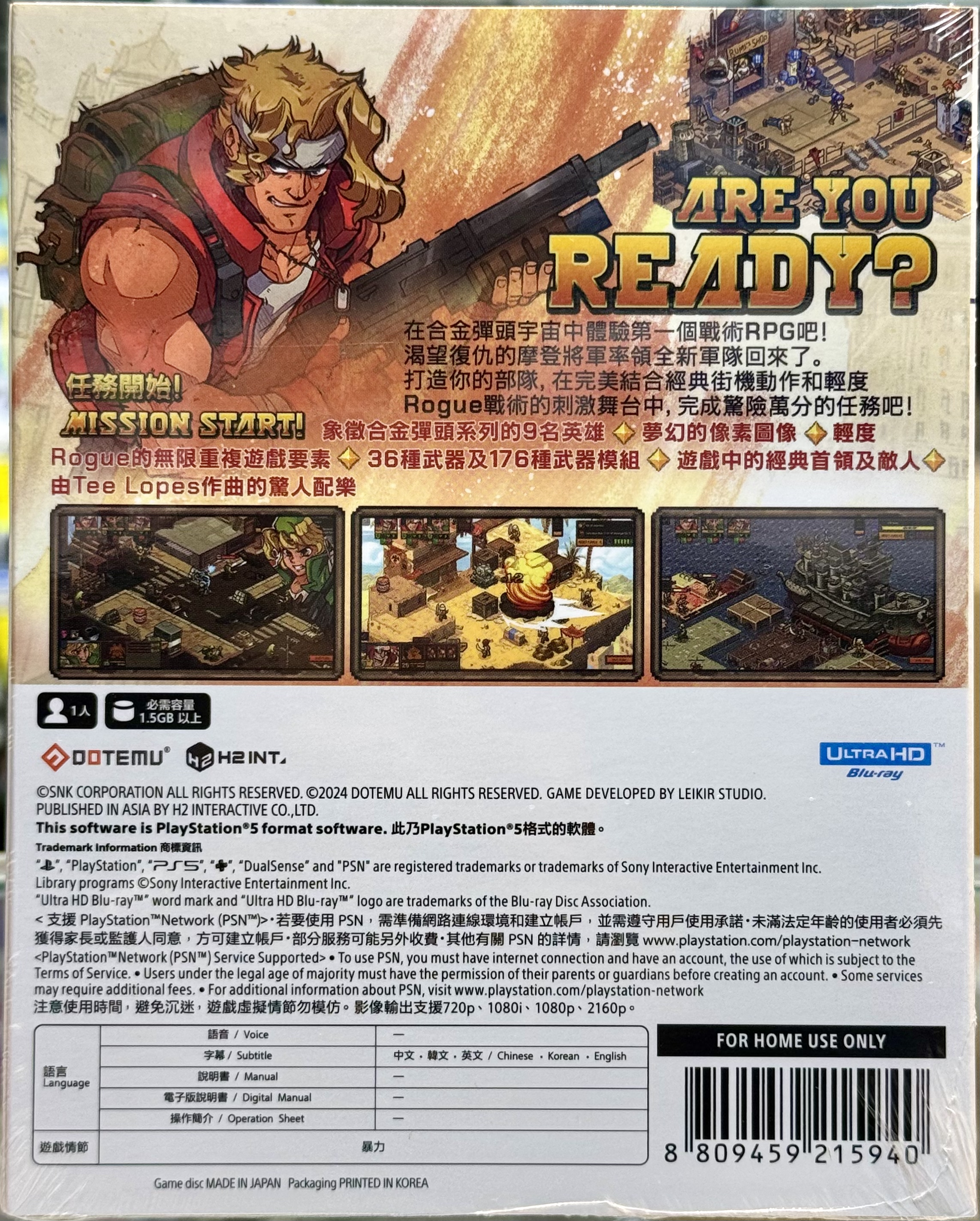 對應平台:PlayStation 5 遊戲字幕:中/英文 遊玩人數:1人 《合金彈頭:戰略版》將深受玩家喜愛的《合金彈頭》系列中槍掃炮炸的爽感和百玩不厭的樂趣融入了全新的戰術場景!準備好踏上一場緊張刺激的經典動作街機與Roguelite戰術之旅。投身戰區,以全新的方式喚醒你對《合金彈頭》的回憶吧! 遊戲玩法 包含Roguelite元素的戰術RPG 你將在《合金彈頭:戰略版》中以一種全新的視角體驗《合金彈頭》系列中的經典戰鬥。將經典動作和戰術深度完美融合,帶領小隊利用戰略詭計和優勢火力取得勝利。釋放強大的特殊攻擊並決定每次遭遇的結果! 在戰鬥中積累經驗,解鎖武器和特殊能力,升級小隊的火力和戰術技能。 集結你的隊伍,在這款致敬經典的重製版作品中改寫戰場規則! 士兵們,準備戰鬥!任務開始! 從《合金彈頭》系列和你出生入死的經典角色中挑選隊員,組建完美小隊,阻止摩登的邪惡計劃。 找到武器配置和改裝的最優解,在戰場上展開最有效的連擊。 利用「連攜」機製發動同步攻擊,對敵人造成巨量傷害!當小隊陷入危機,你可以隨時召喚增援,盡享火力之美:重型火炮、空中打擊、乃至名副其實的「合金彈頭」。一聲令下,應有盡有! 為勝利而戰 在精美的手繪地圖上展開振奮人心的戰役,徹底擊敗惡名昭著的叛軍,為戰爭畫下句點!您將面對重重艱險,不要畏懼死亡,不要放棄,戰鬥到底。 無論你是久經沙場的老兵還是剛入伍的新兵,都能在重復遊玩任務中體會樂趣,在每次冒險中加深對策略的理解,在每場艱難的的勝利中磨礪技巧。 獲取經驗、升級幹員、適應敵人,記住:每次失敗都是在積累經驗,勝利只屬於永不言棄者! 故事 唐納德·摩登卷土重來!蟄伏在一個敵視世界政府的國家多年後,這名邪惡的將軍精心策劃了一場政變。現在,他準備帶領多年來秘密培養的軍隊,向全世界展開復仇。 在戰爭釀成無法挽回的災難前,遊隼小隊將不惜一切代價突破敵人的防線,直取摩登將軍! 購買須知﹕ ※客人可選擇到店自取。 ※客人亦可選擇順豐速運(運費到付)。 ※全店購物三件或以上免運費到順豐站或智能櫃。 ※所有全新原裝遊戲開封後不設退換。 ※圖片只供參考,實際貨品可能根據批次不同而略有不同。 ※如有任何查詢,歡迎隨時向我們聯絡。